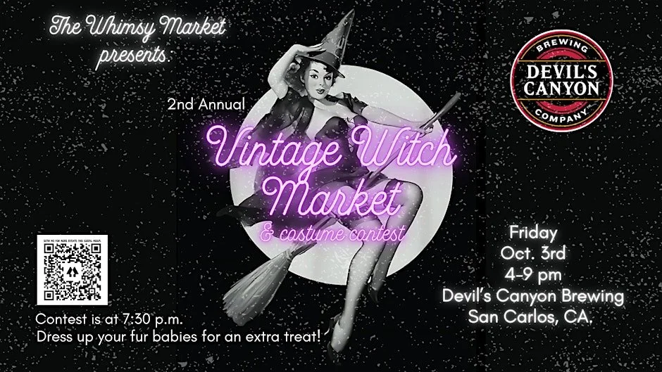 Devil's Canyon Brewing Company, 935 Washington St, San CarlosCalling All Witches! It's almost Halloween, so that means it's time to dress up and join us for our Vintage Witch Market. Once again, we'll be giving away prizes for the following three adult costume categories: Sexy Witch, Vintage Witch, and Movie Witch. Start planning your outfit while our artisans begin crafting their magickal goodies! We'll have over 40 witchy vendors selling antiques, crystals, vintage clothing, pottery, jewelry, bath and body products, candles, spell kits, altar supplies, divination tools, dried herbs, brooms, and much more!