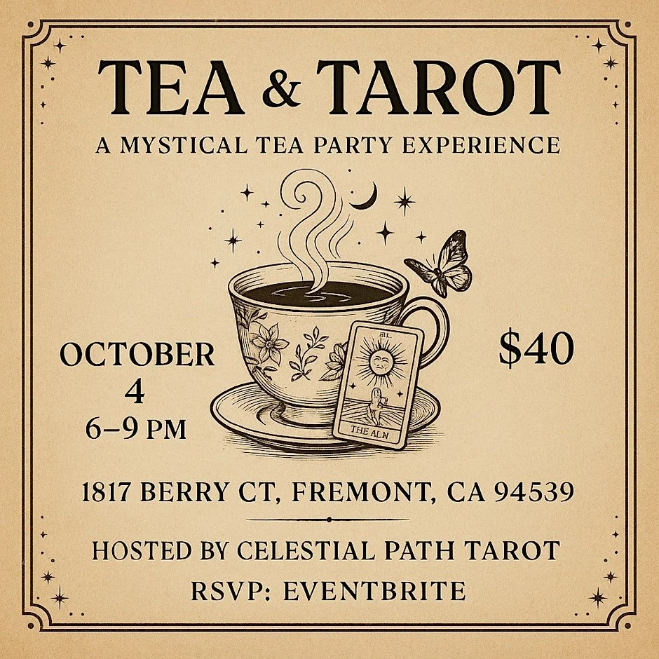 1817 Berry Ct, FremontSip tea, enjoy light bites, and uncover a tarot card chosen just for you. Experience a guided ritual, uplifting mini-readings, and group reflections in a cozy, beginner-friendly setting. End the night with a sweet closing ritual and a special surprise keepsake to carry the magic home. Hosted by Celestial Path Tarot.